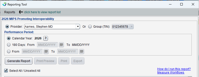 - From the Reporting Tool, go to Reports > MIPS Promoting Interoperability > 2026 MIPS Promoting Interoperability