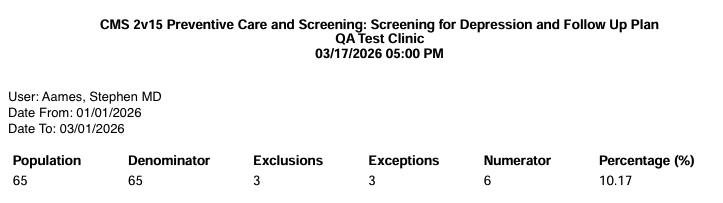 The eCQM report will display the Population, Denominator, Exclusions, Exceptions, and Numerator for the measure and Percentage at which the measure is met.